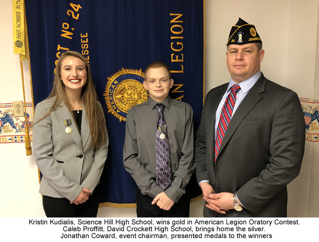 The 87th Annual American Legion Oratory Contest, 1st District level, was held at the Kings Mountain Post 24, 409 E. Market Street, Johnson City, on Saturday, 20 Jan 2018. Caleb Proffitt, a freshman at David Crockett High School, was the runner up.